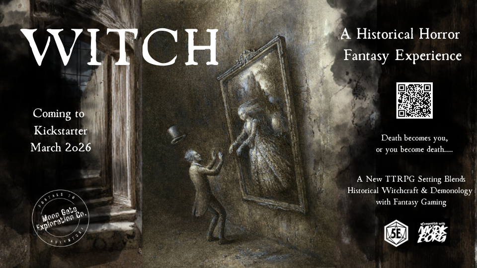 A new Kickstrter project from NamaStacy, the Colorado Springs GM and creator of the Moon Gate Exploration Co. WITCH blends historical witchcraft practices with the dark, ominous atmopshere emblematic of games in the Mörk Borg family.